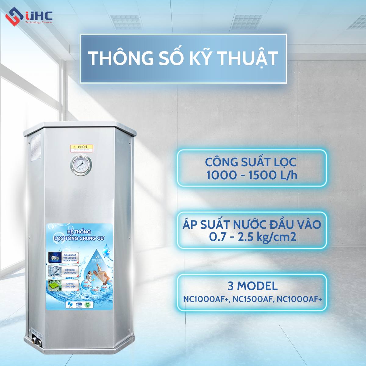 Hiểu rõ vấn đề đó, UHC cho ra đời Hệ thống xử lý nước tổng model NC1500AF – hệ thống xử lý nước tổng chuyên dụng cho nguồn nước máy, ứng dụng công nghệ lọc đa tầng tiên tiến, giúp: