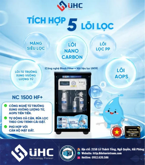 Với sự phát triển như vũ bão của cuộc cách mạng công nghệ 4.0, nắm bắt được tình hình nước sinh hoạt đang bị ô nhiễm nghiêm trọng như hiện nay, UHC Việt Nam đã ứng dụng công nghệ xử lý nước tiên tiến và điện tự động hóa vào quy trình xử lý nguồn nước với Hệ thống xử lý nước tổng NC1500HF+ bao gồm các chức năng: