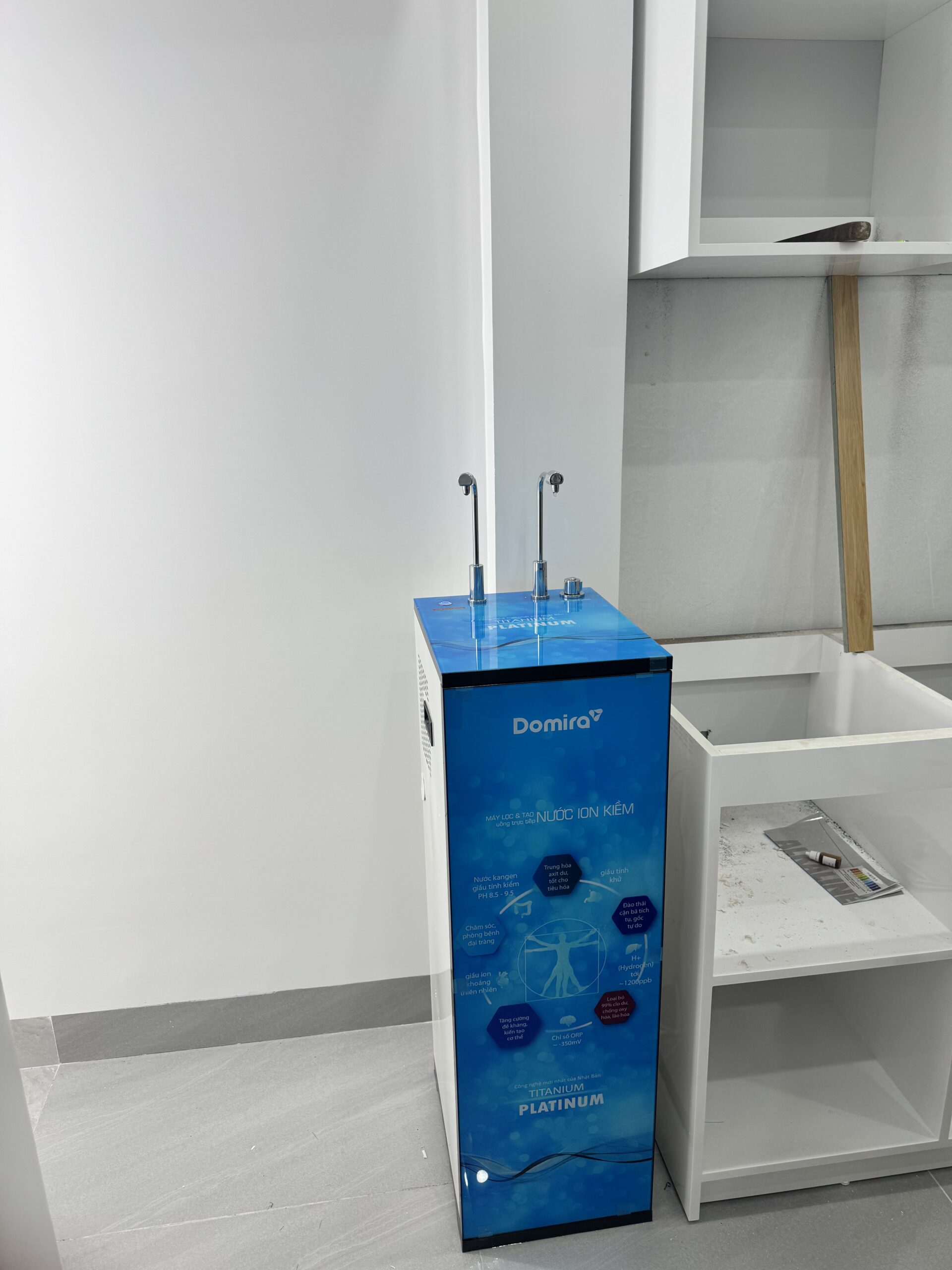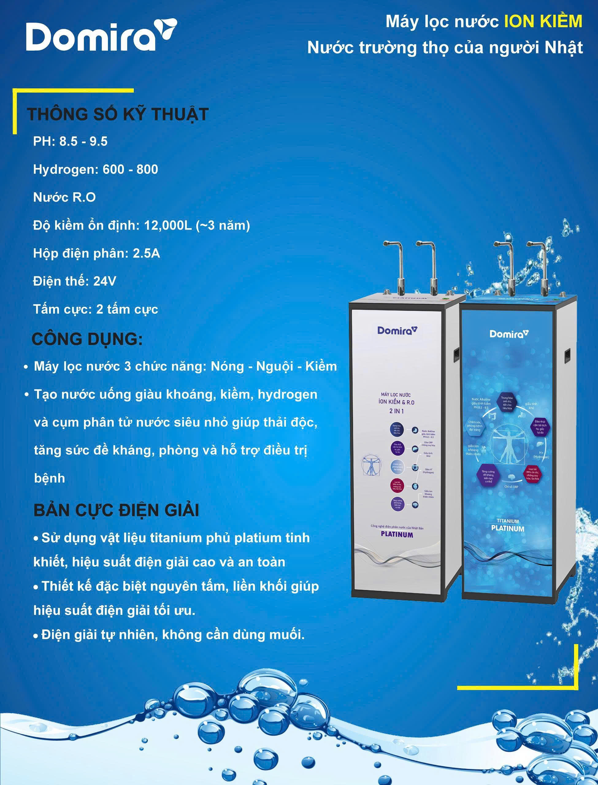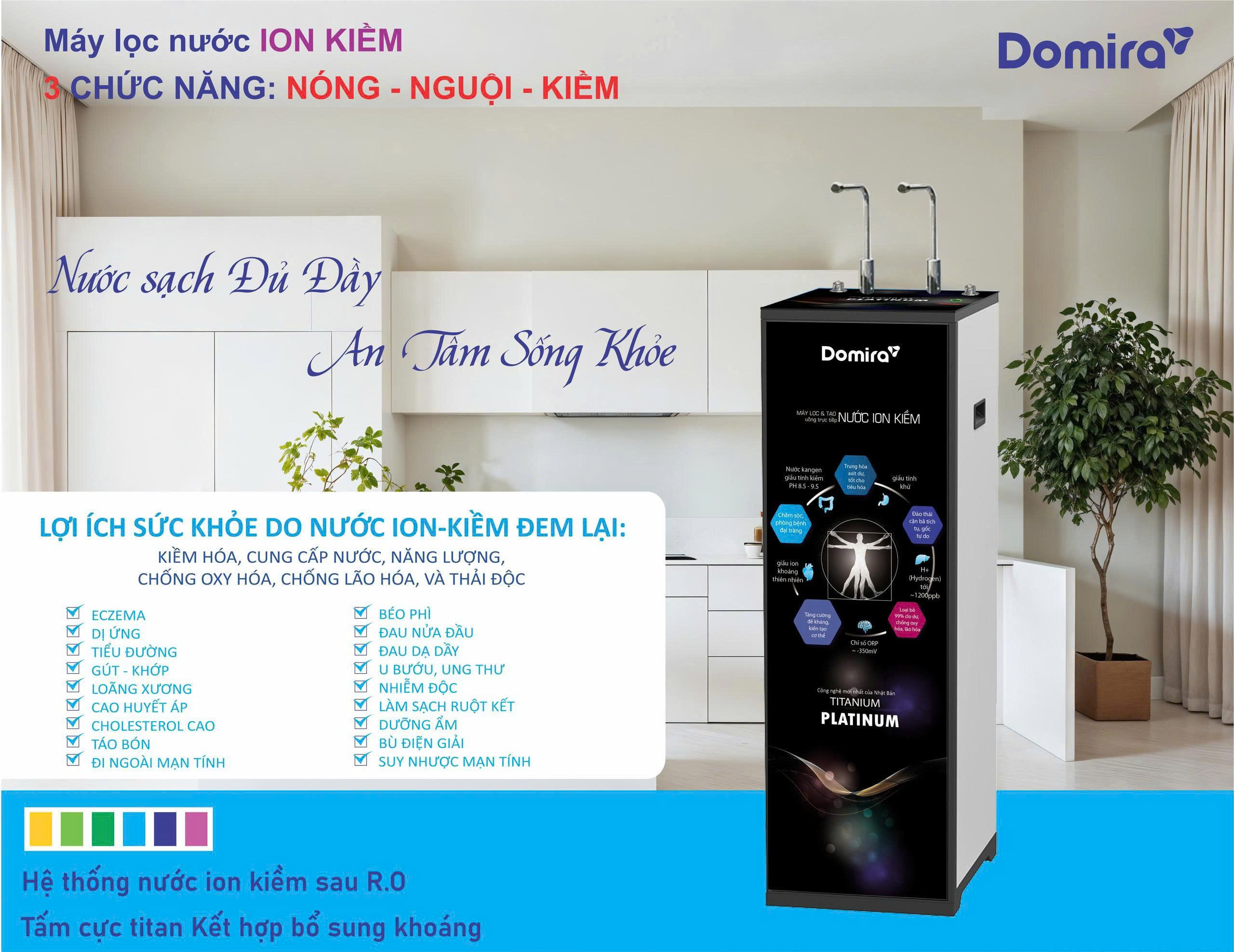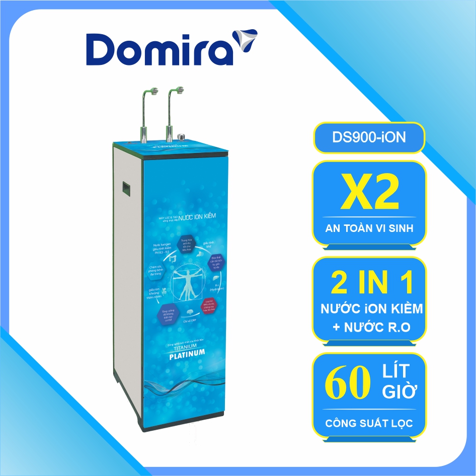 Máy lọc tạo ion kiềm DOMIRA DS-900ION tích hợp 2 hệ thống lọc hiện đại. Hệ thống tạo nước ion kiềm giàu ORP dùng trực tiếp cho ăn uống, giúp chống oxy hóa, hỗ trợ sức khỏe và làm chậm lão hóa, với bộ điện phân Titanium 100% phủ Platinum nguyên chất, đạt tiêu chuẩn chất lượng hàng đầu thế giới. Song song, hệ lọc RO tạo nguồn nước tinh khiết an toàn, tái tạo khoáng, đáp ứng toàn diện nhu cầu sử dụng trong gia đình.